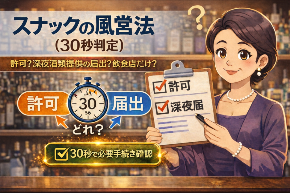 スナックは店名で決まりません。実態(接客の仕方)と営業時間で、必要な手続きは次の3つに分かれます。
